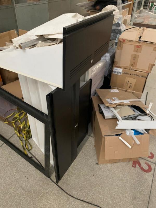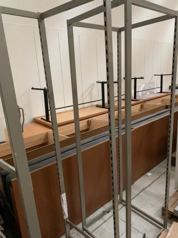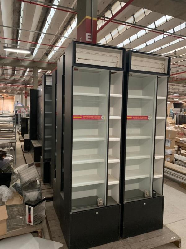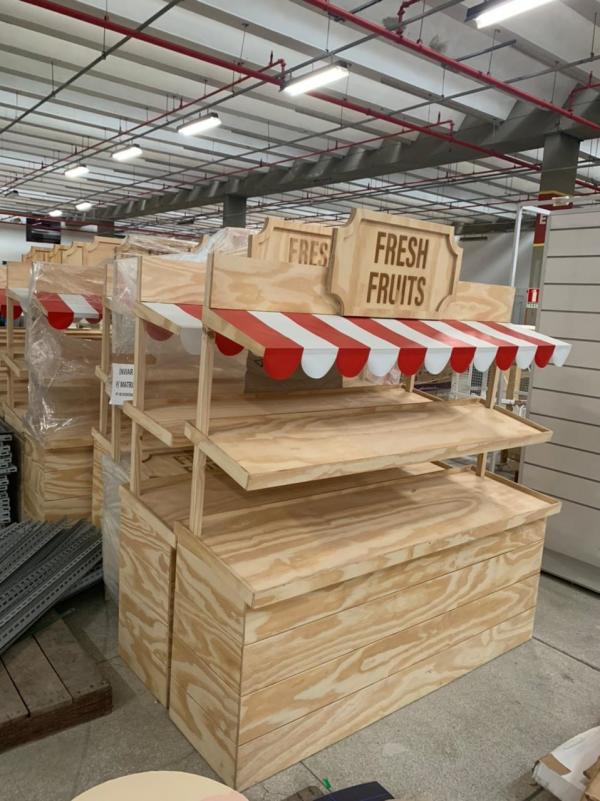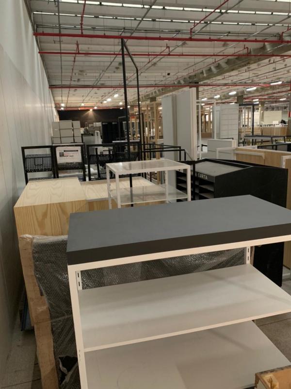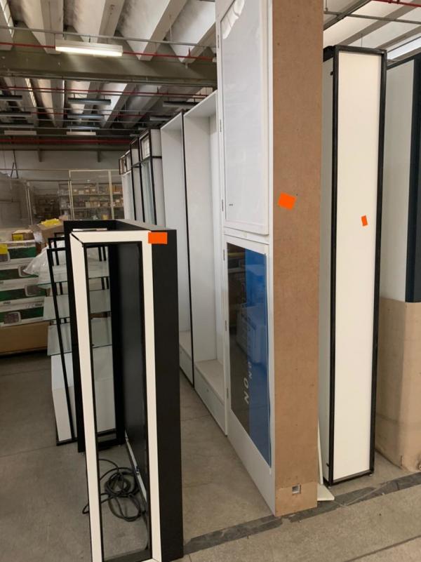 Lote de artigos de visual merchandising entre balcões, expositores, araras dentre outros, contendo aproximadamente 80 itens. Sem garantia. No estado em que se encontra, custos de desmontagem, remoção e transporte por conta do arrematante.