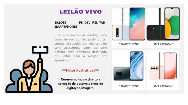 LOTE PE_DEV_REL_TAB_ SMARTPHONES COM APROXIMADAMENTE 115 ITENS. Produtos novos ou usados, com sinais de uso ou não, podendo ter contas vinculadas ou não, com ou sem acessórios, com ou sem defeito. Vide descrição detalhada no Edital com a relação dos aparelhos. SEM GARANTIA. NO ESTADO EM QUE SE ENCONTRA. CUSTOS DE REMOÇÃO E TRANSPORTE POR CONTA DO ARREMATANTE.