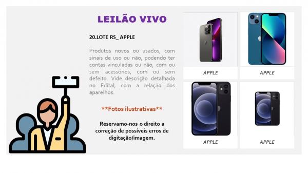 LOTE RS_ APPLE COM APROXIMADAMENTE 09 ITENS. Produtos novos ou usados, com sinais de uso ou não, podendo ter contas vinculadas ou não, com ou sem acessórios, com ou sem defeito. Vide descrição detalhada no Edital com a relação dos aparelhos. SEM GARANTIA. NO ESTADO EM QUE SE ENCONTRA. CUSTOS DE REMOÇÃO E TRANSPORTE POR CONTA DO ARREMATANTE.