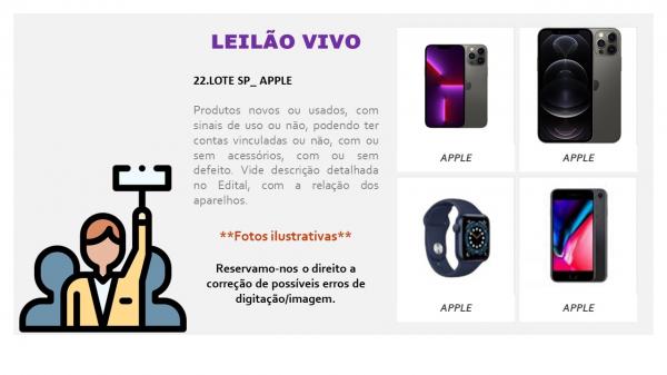 LOTE SP_ APPLE COM APROXIMADAMENTE 19 ITENS. Produtos novos ou usados, com sinais de uso ou não, podendo ter contas vinculadas ou não, com ou sem acessórios, com ou sem defeito. Vide descrição detalhada no Edital com a relação dos aparelhos. SEM GARANTIA. NO ESTADO EM QUE SE ENCONTRA. CUSTOS DE REMOÇÃO E TRANSPORTE POR CONTA DO ARREMATANTE.