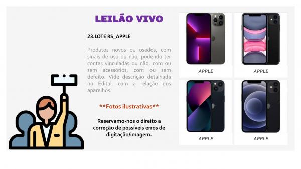 LOTE DE APPLE IPHONE, LOCALIZADOS EM NOVA SANTA RITA/RS, COM APROXIMADAMENTE 10 ITENS, ENTRE: APPLE IPHONE 13 PRO MAX 128GB GF, APPLE IPHONE 13 512GB AZ, APPLE IPHONE 13 128GB AZ, APPLE IPHONE 13 128GB AZ N, APPLE IPHONE 11 128GB NAC PT, APPLE IPHONE 11 64GB NAC PT, APPLE IPHONE 12 MINI 64GB PT, APPLE IPHONE 12 64GB NAC PT, APPLE IPHONE 12 128GB PT. Produtos novos ou usados, com sinais de uso ou não, podendo ter contas vinculadas ou não, com ou sem acessórios, com ou sem defeito. Vide descrição detalhada no Edital com a relação dos aparelhos. SEM GARANTIA. NO ESTADO EM QUE SE ENCONTRA. CUSTOS DE REMOÇÃO E TRANSPORTE POR CONTA DO ARREMATANTE.