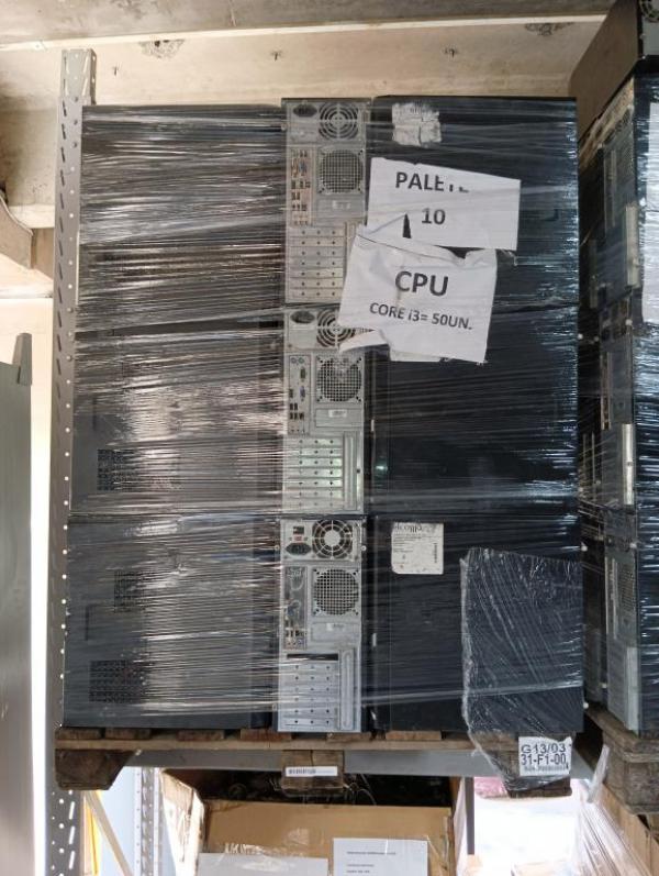 PALETE 10 – APROX. QTDE 50, sendo: 50 CPU CORE I3, 4GB MEMORIA, SEM HD, COM PROCESSADOR, EQUIPAMENTOS SERÃO VENDIDOS SEM GARANTIA, O ESTADO QUE SE ENCONTRAM, PODEM APRESENTAR DEFEITOS. NÃO ACOMPANHA FONTES OU CABOS, NÃO HÁ GARANTIA PARA ESTES ITENS/EQUIPAMENTOS. CUSTOS DE REMOÇÃO E TRANSPORTE POR CONTA DO ARREMATANTE. Local: Av. Amélia Latorre, 11 - Jardim Guanabara, Jundiaí/SP.