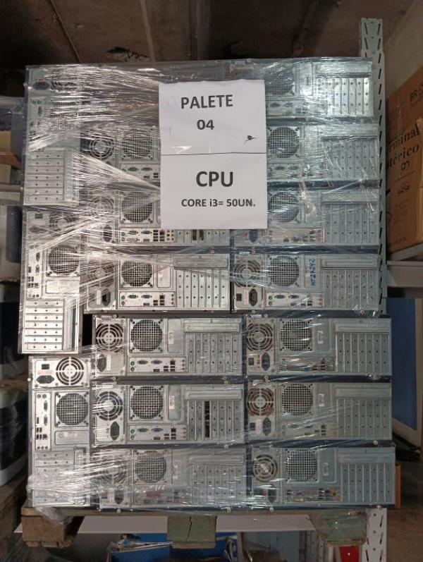 PALETE 04 – APROX. QTDE 50, sendo: 50 CPU CORE I3, 4GB MEMORIA, SEM HD, COM PROCESSADOR, EQUIPAMENTOS SERÃO VENDIDOS SEM GARANTIA, O ESTADO QUE SE ENCONTRAM, PODEM APRESENTAR DEFEITOS. NÃO ACOMPANHA FONTES OU CABOS, NÃO HÁ GARANTIA PARA ESTES ITENS/EQUIPAMENTOS. CUSTOS DE REMOÇÃO E TRANSPORTE POR CONTA DO ARREMATANTE. Local: Av. Amélia Latorre, 11 - Jardim Guanabara, Jundiaí/SP.