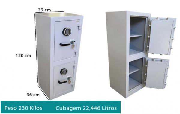 Rio De Janeiro/RJ - 1 (um) COFRE CONCRETADO CD 120 BLI COFRE DUPLO - Especificações: Cofre com segredo mecânico (três combinações numéricas). Fechadura Mecânica com chaves. Volante (Maçaneta). Possui internamente duas prateleiras removíveis, formando quatro vãos. Construído em chapa de aço, caixão interno e externo, preenchido com concreto de dura resistência. Corpo externo e interno construídos em chapa de aço SAE 1010/1020 espessura 2 mm. Concreto agregado com areia, cimento e brita proporcionando uma excelente dureza. Paredes laterais, teto e fundo com no mínimo 50 mm de espessura. Porta com folha inteiriça de 3 mm - 3,17 mm com forra cimentada (anti-broca) e quadro batente de 6mm.(dificulta abertura com o pé de cabra). Ferrolhos horizontais móveis para a direita e fixos para a esquerda. Medidas Externas: Altura: 120,00 cm. Largura: 39,00 cm. Profundidade: 36.00 cm. Profundidade com a maçaneta: 41cm. Medidas internas: Altura: 45,50 cm. Largura: 33,00 cm. Profundidade: 29,00 cm. Peso: 230,00 kg - Cubagem: 22,446 Litros. No estado em que se encontra, sem garantia, custos de remoção e transporte por conta do arrematante. Localização do bem: Avenida Getulio Vargas, 1380 - Bairro: Olinda - Cidade: Rio De Janeiro - UF: RJ - CEP: 26.525-022