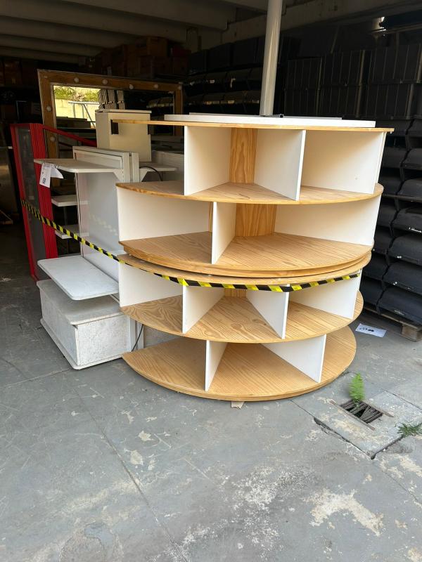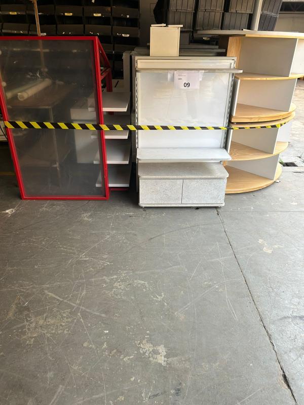 Lote 9 - LOTE CONTENDO 01 ARMARIO/BALCAO REDONDO, 09 MESAS, 01 CORTINA, 01 ARMARIO, 01 ROUPEIRO AÇO, 12 GAVETEIRO, 02 GONDOLO EXPOSITOR.